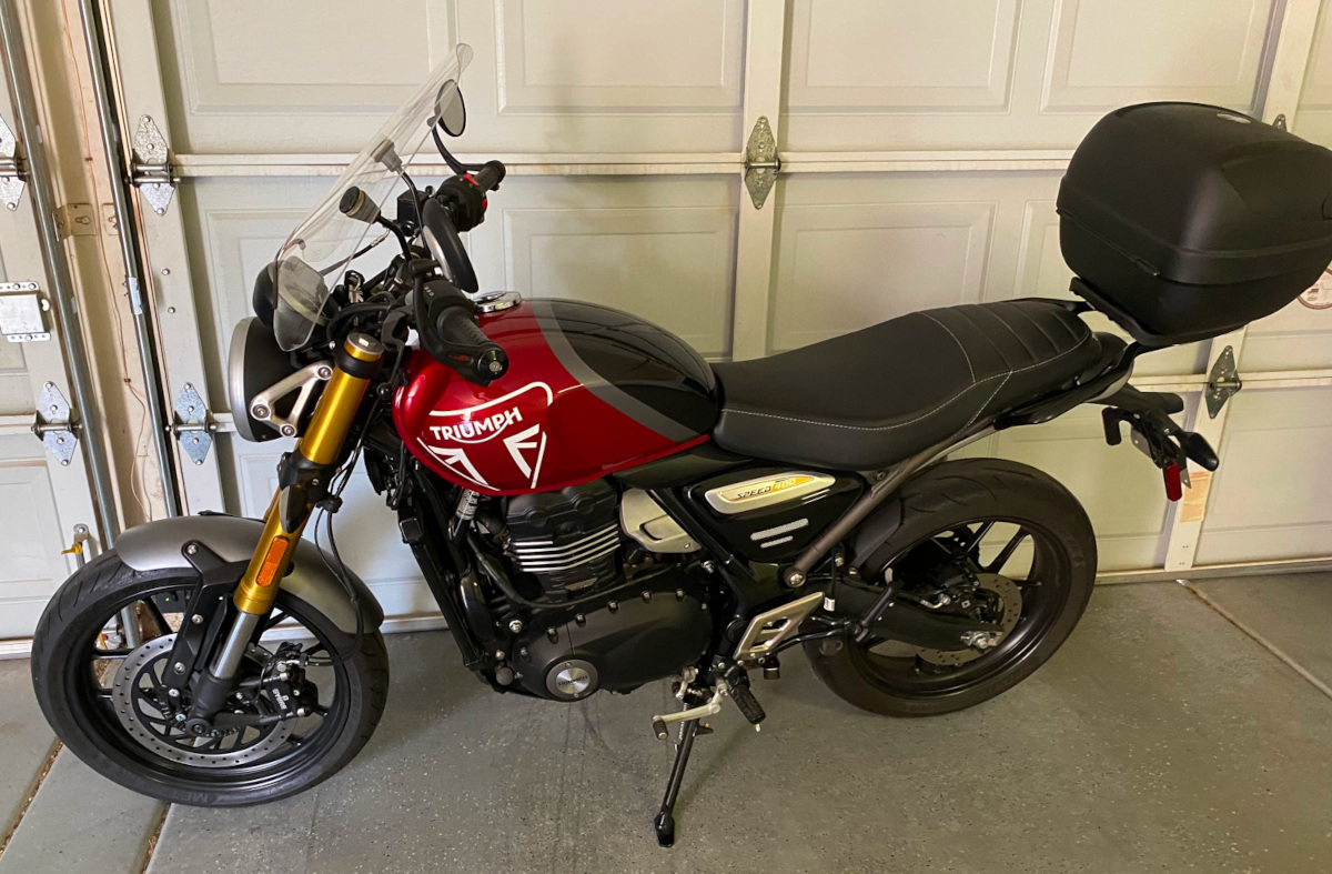 The first areas that needed addressing were the lack of storage and getting buffeted by the wind at highway speeds. This rack mount / top box combo added