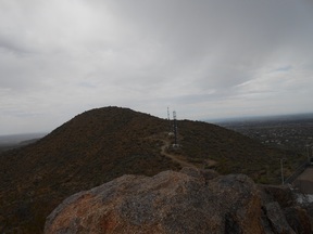from here you can see, in this order, Camelback Mountain, Four Peaks, Wind Cave of Usery Mountain Regional Park, and the Rio Salado Sportsman s
