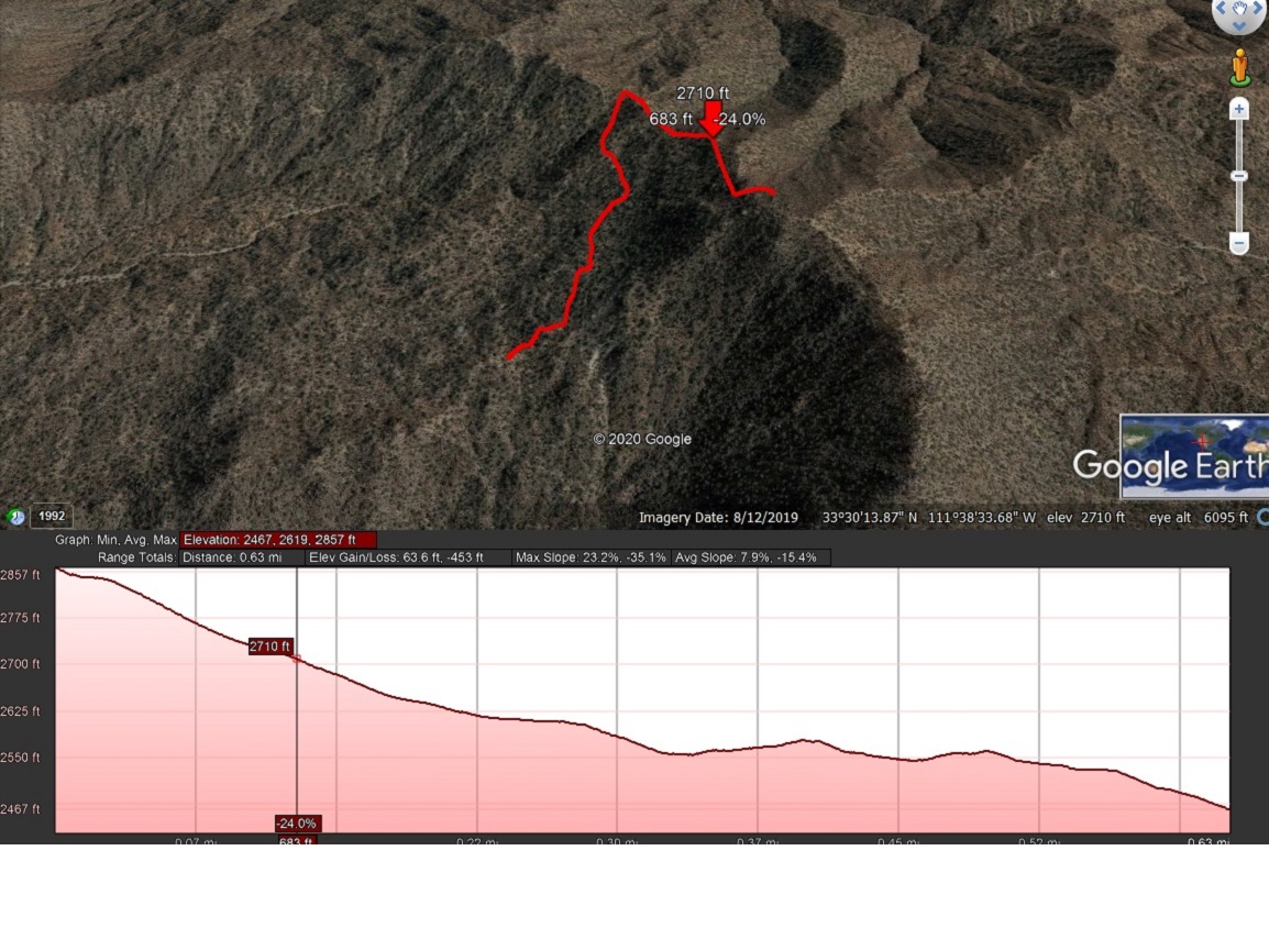 This chart shows the trail being hiked from the top to back to the Lower, Upper Gidro trail sign. The arrow is approximately the end